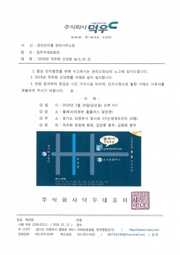 ■ 2018년 덕우회 신년회를 개최합니다. 페이지 정보 작성자 최고관리자 (115.♡.139.242) 작성일18-01-11 13:06 조회8,024회 댓글0건 관련링크 이전글 다음글 목록 본문 전원 참석하시어 뜻깊은 시간을 가졌으면 좋겠습니다.단지사정으로 불참시에는 사유서를 제출하여 주시기 바랍니다. 댓글목록 등록된 댓글이 없습니다. 이전글 다음글 목록