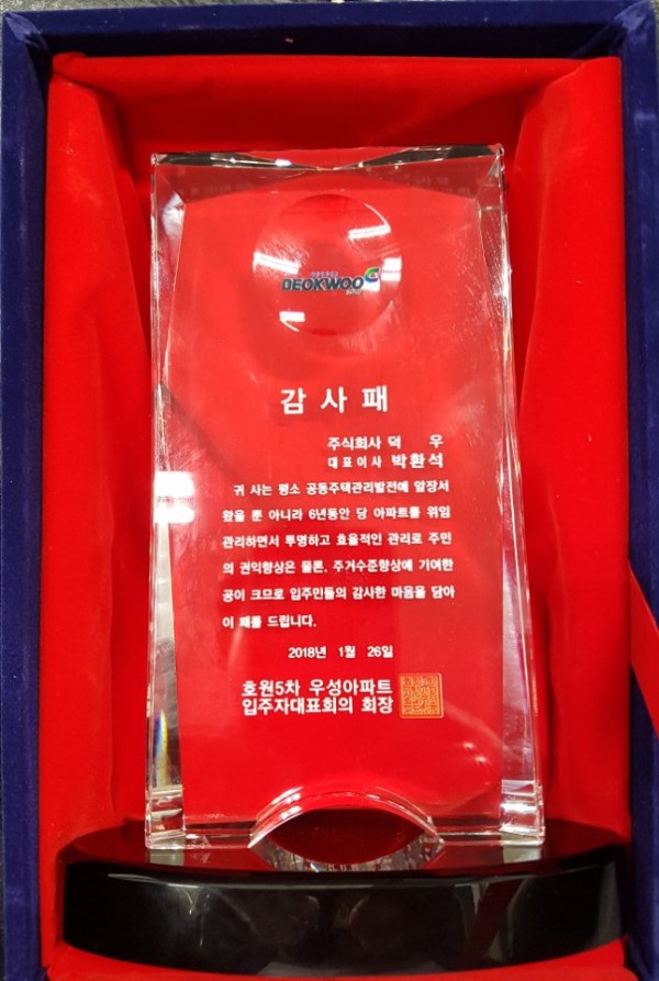 2018년 1월 26일 호원우성5차아파트 입주자대표회의 회장으로부터 투명하고 효율적인 관리로 주민의 권익향상과 주거수준향상에 기여한 공을 인정받아 감사패를 받았습니다.